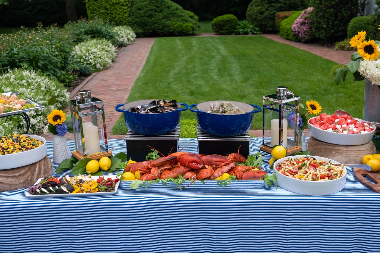 Add-ons to the buffet include lobster, shrimp kebabs, a wings station, strip steak, pork ribs, roasted salmon, beef brisket, black bean burgers, a raw bar, and grilled vegetables. All packages include plastic cooler chests, plastic cups, ice scoops, tubs, ice, and colored table linens, as well as the addition of a bartender(s) if required. Full bar service available.